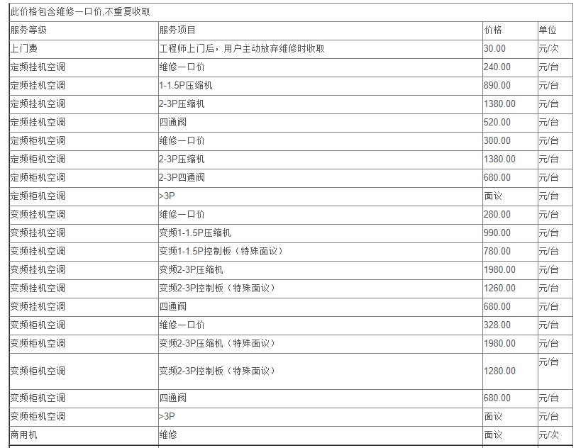 8、更換連接銅管不屬于維修范疇,按安裝價格執行。
